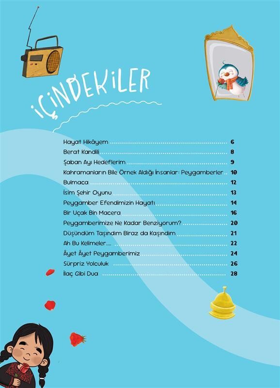 Dergiyle birlikte gelen Mescid-i Nebevî maketi, ara tatil için oyun ve etkinlik önerileri posteri, şaban ayı görev kartları ve Mekke-Medine oyun haritası hediyedir.